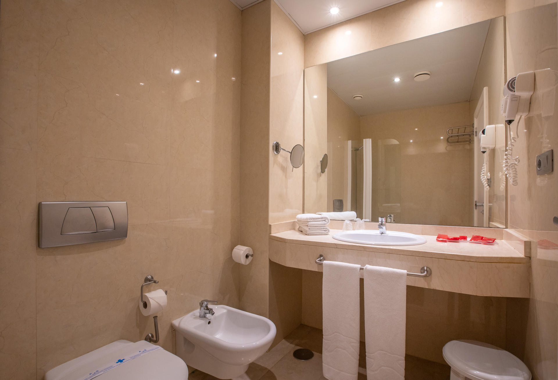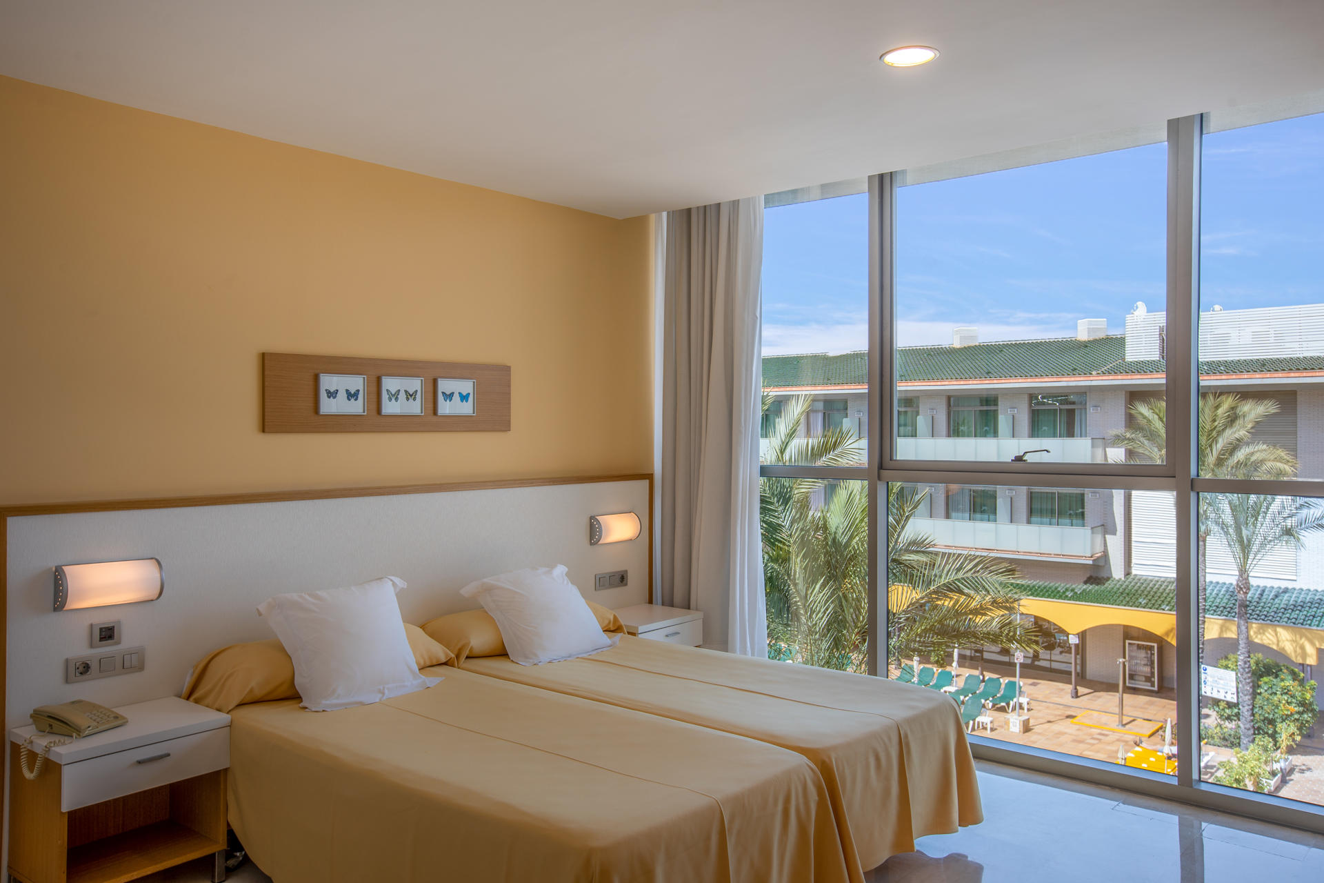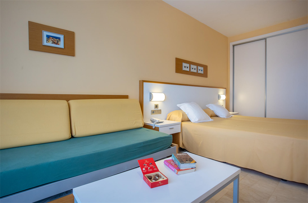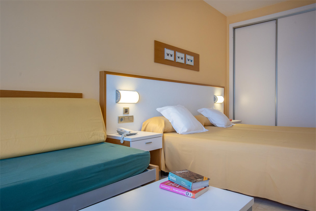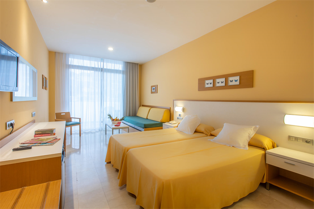 Voir chambreChambre spacieuse, d’environ 30 m2, avec deux lits simples et un canapé-lit, une grande terrasse et une salle de bains complète. Toutes les chambres sont extérieures.
